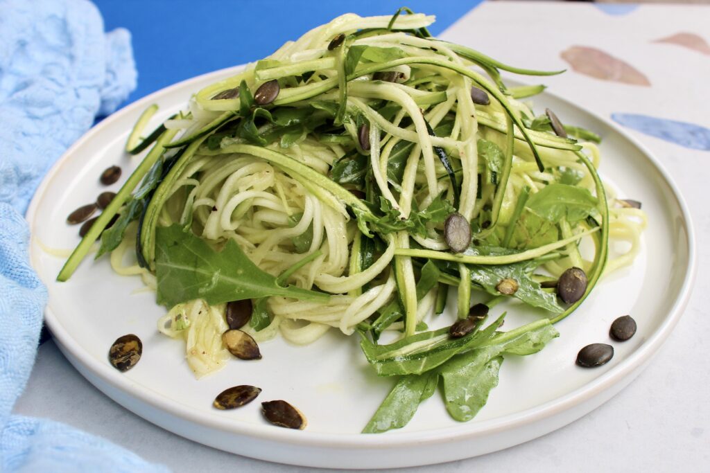 Makaron z cukinii z ziołami to lekkie, świeże danie z bazylią, rukolą, oliwą z oliwek i pestkami dyni. Idealne na zdrowy, aromatyczny posiłek.