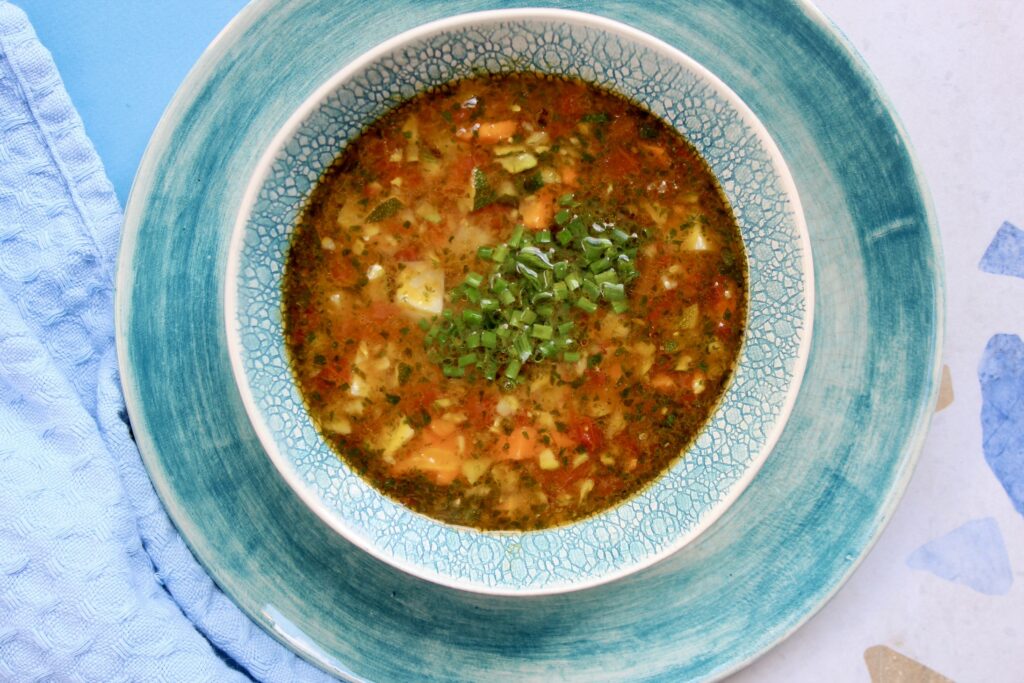 Poznaj smak zupy jarzynowej z pesto – aromatyczne warzywa, świeże pesto i wyrazisty bulion tworzą kompozycję pełną świeżości i smaku!