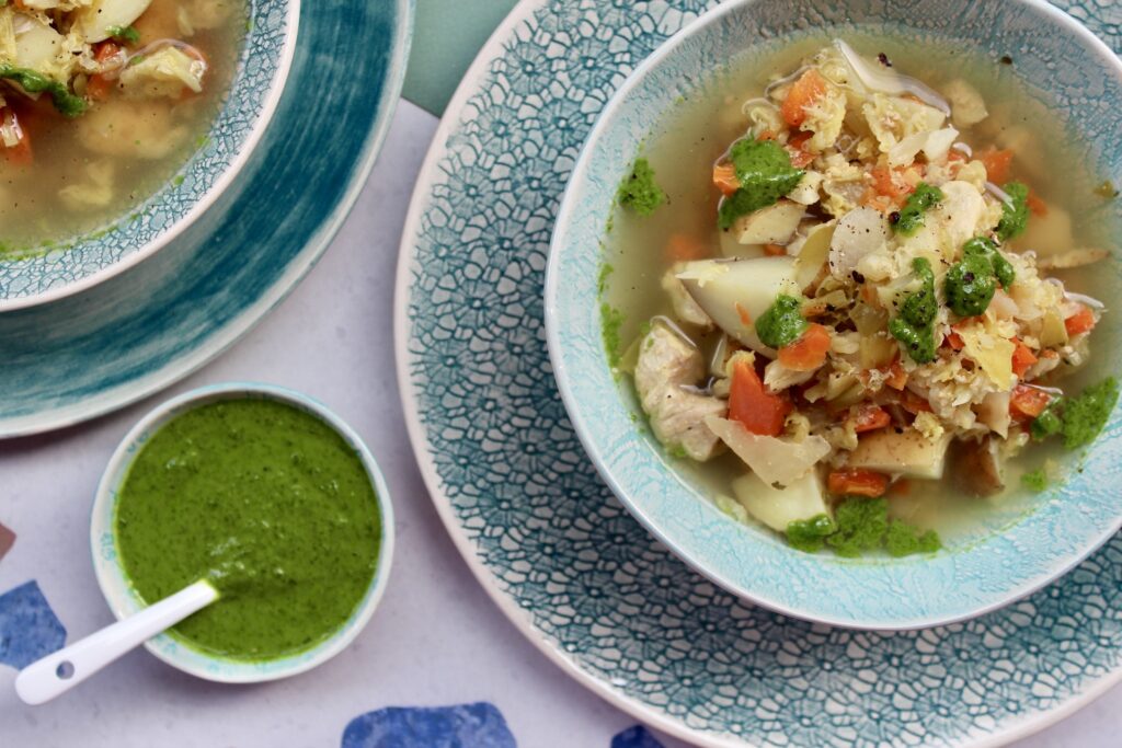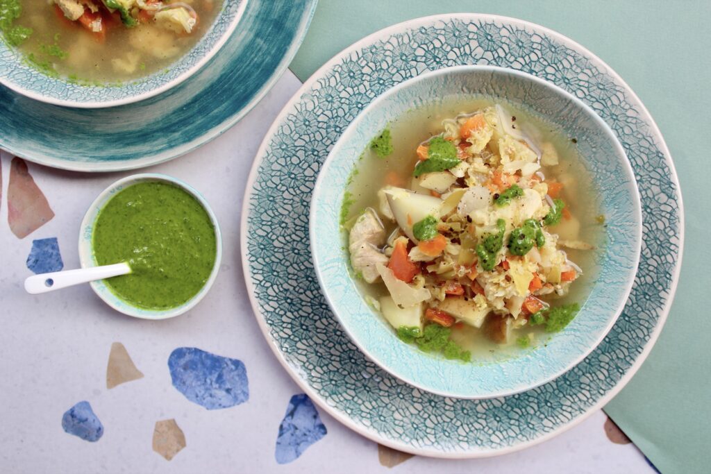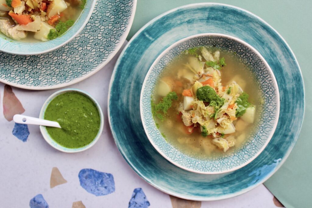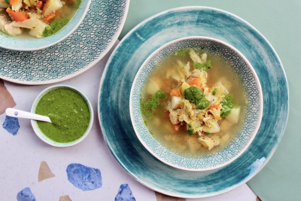 Zupa ziemniaczana z warzywami i kurczakiem podawana z pesto. Szybki i budżetowy obiad dla całej rodziny.